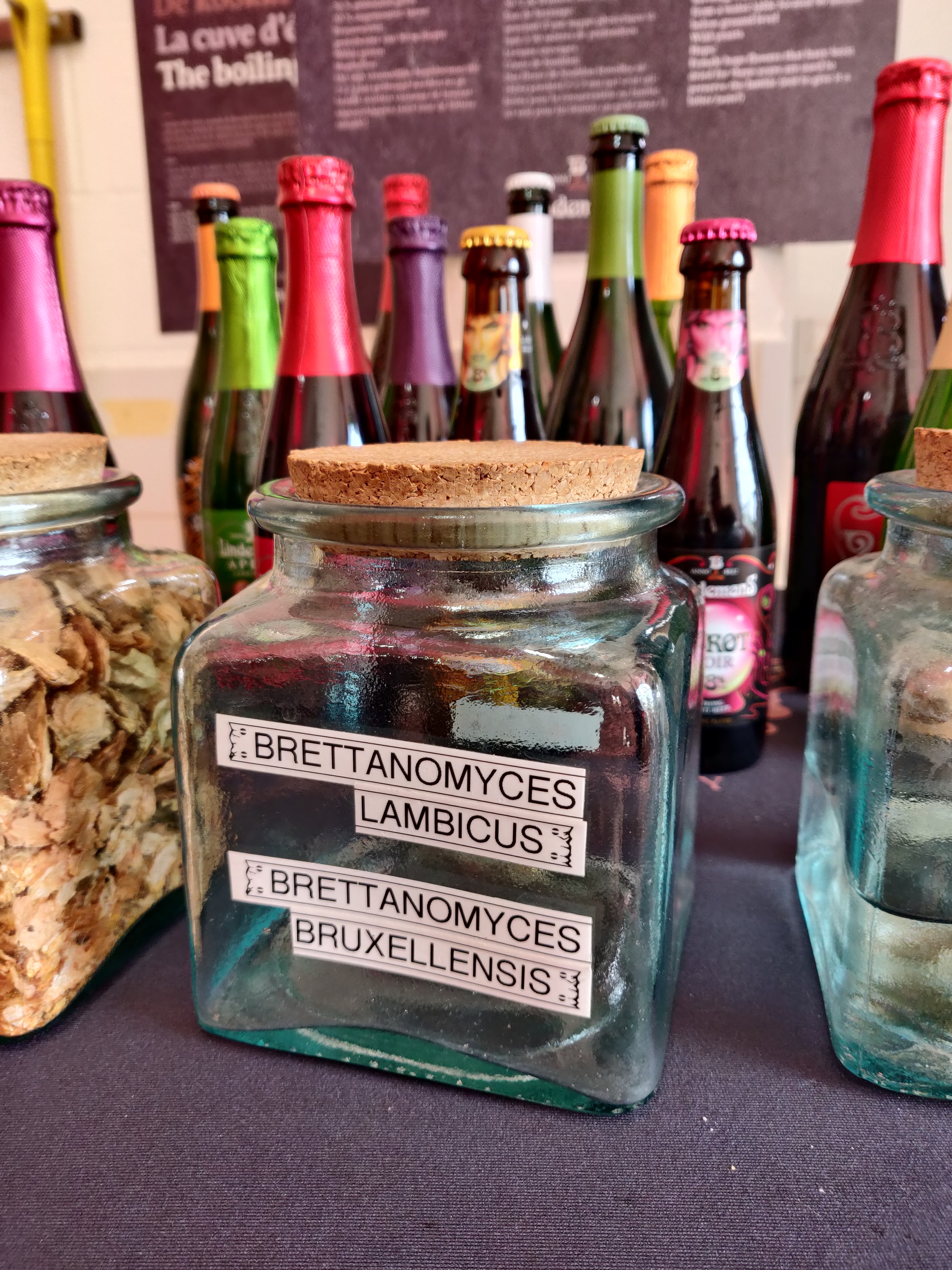 Die Biere werden im Springmaischverfahren hergestellt - wiederum mit dem Ziel die Bildung von 4-VG zu vermeiden. Zur Überraschung deutscher Brauer wird der Iodnormalität nicht die Bedeutung zugesprochen, die man bei Bieren deutscher Brauart erwartet. Das liegt an den Hefen, die für den Gärvorgang verantwortlich sind. Im Gegensatz zu vielen anderen Bierstilen, sind Lambic-Biere nämlich spontanvergoren. Nach dem Kochvorgang kommt die Würze auf das Kühlschiff, auf dem die Würze mit der Umgebungsluft in Kontakt kommt und beim Abkühlen inkubiert wird, wobei das Abkühlen in möglichst kurzer Zeit erfolgen soll. Besonders Brettanomyces Bruxellensis and Brettanomyces Lambicus, aber auch Saccharomyces-Hefen und Pediokokken bestimmen den Gärverlauf. Die Mystik nimmt seinen Lauf... Wobei die Lambic-Brauer genau wissen, was sie machen. Denn um auf die vielseitigen Mikroben und deren Biotransformationen einzugehen, muss die Bereitstellung der Nahrung (Substrat) stimmen. Dies wird über die Sudhausarbeit reguliert. Da v.a. Brettanomyces-Hefen fast alle Arten von Zuckern in unterschiedlicher Geschwindigkeit verarbeiten können und die Lagerung von Lambic über mehrere Jahre vonstatten gehen kann, muss auch Substrat für mehrere Jahre zur Verfügung stehen. Daher werden neben Mono- und Disacchariden auch Oligo- und Polysaccharide nach dem Maischvorgang benötigt. Und das ist der Grund warum belgische Lambic-Brauer gar nicht böse sind, wenn ein Blausud aus dem Sudhaus ausgeschlagen wird. Der "Rohstoff" Hefe wurde bei Lindemans sehr praxisnah dargestellt :-)