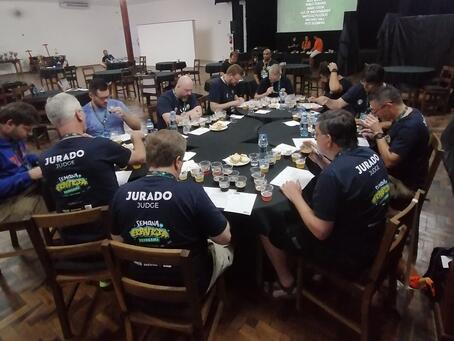 The last round of the day was Italian Grape Ale. If you would like to know more about this beer style, you are welcome to take a look at the blog post on the Birra dell'Anno 2024. Local beer judge Eduardo Pelizzon and Italian Giorgio Marconi (a wine sommelier as well as a beer sommelier) were the absolute experts at the table. What is rather unknown in our part of the world is that there are some very good wine producers in Brazil who also try their hand at Italian Grape Ale. And quite successfully, as the quality of the final IGAs impressively demonstrated. Saison was often chosen as the base beer style. Gewürzaminer must, Moscato or Pinot Noir were then added. What was unusual, however, was that with all the excellent beers, every single judge immediately voted for the same beer. An outstanding sample, which, we can reveal, later became the Best of Show Beer.