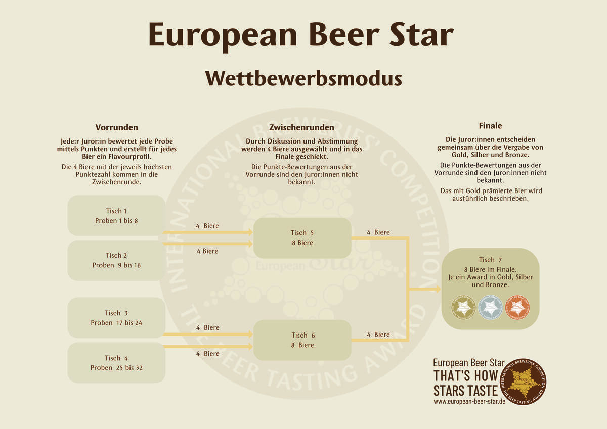 Im folgenden Schema wird der Wettbewerbsmodus des European Beer Star anhand einer beispeilhaften Kategorie mit 32 Einreichungen erläutert.